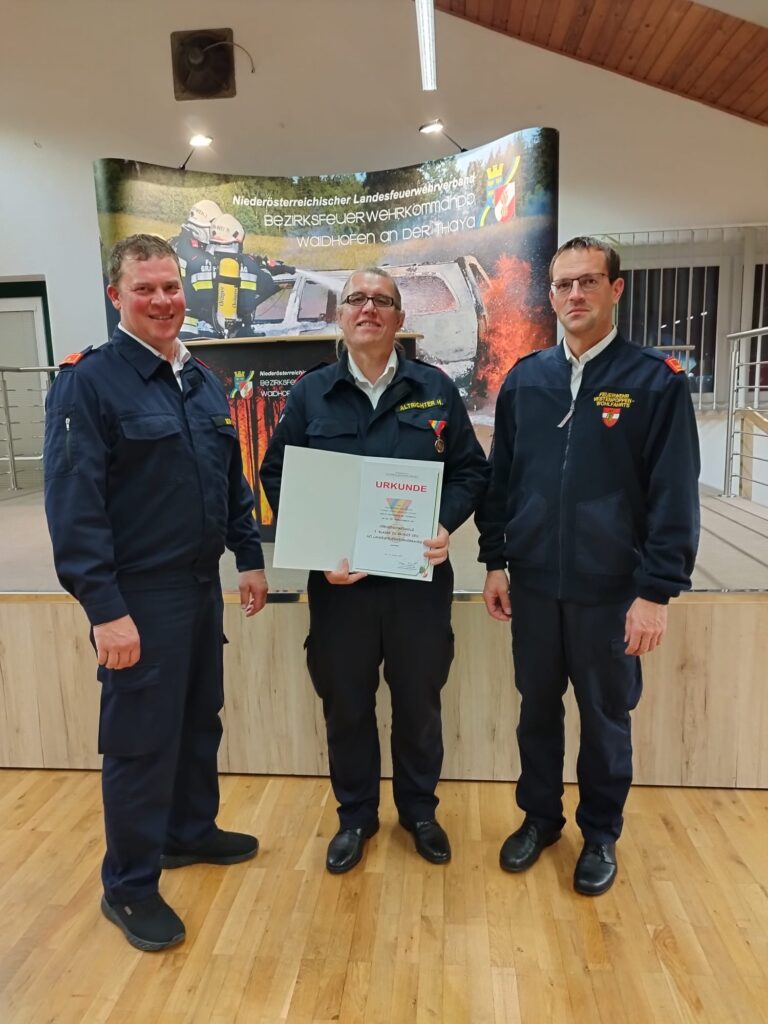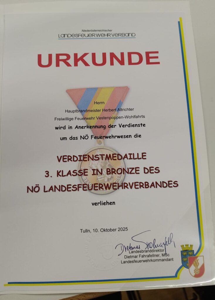 Im Zuge des Bezirksfeuerwehrtages vergangenen Freitag in Pfaffenschlag, wurde unserem Kameraden Herbert Altrichter die Verdienstmedaille 3. Klasse in Bronze vom Nö. Landesfeuerwehrveband für seine langjährige Tätigkeit und Verdienste um das Feuerwehrwesen verliehen. Herzliche Gratulation!