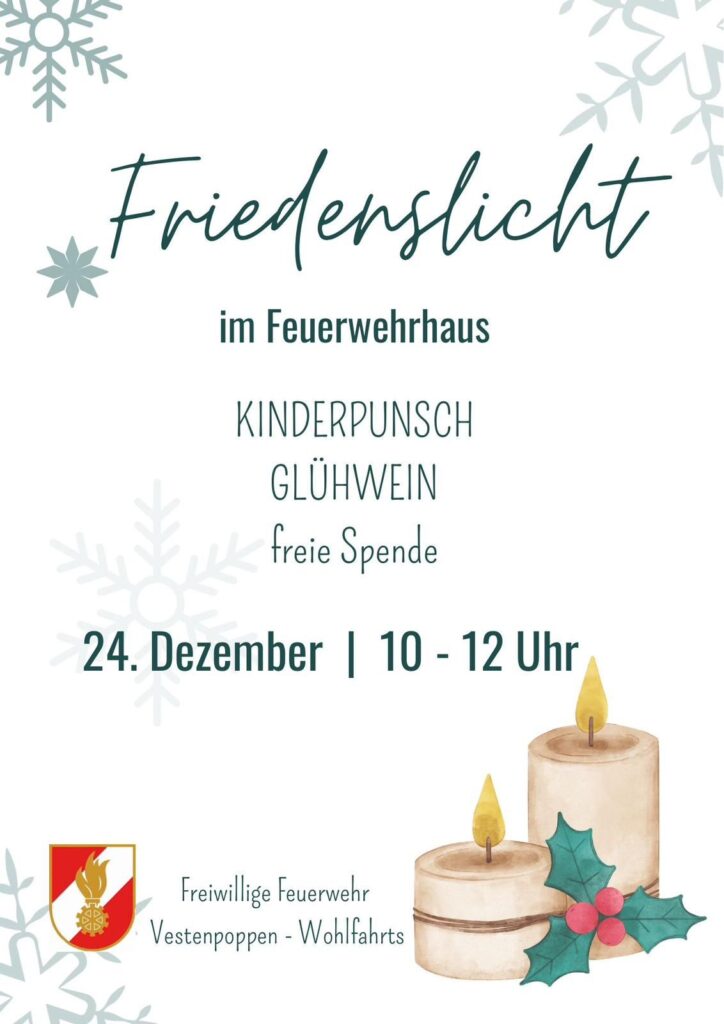 Auch heuer wollen wir euch wieder die Gelegenheit bieten, das Friedenslicht bei uns im Feuerwehrhaus abzuholen. Als kleine Einstimmung auf den Heiligen Abend, versorgen wir euch, gegen freie Spende, mit heißen Getränken. Wir freuen uns auf euer Kommen!